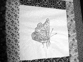 This is a quilt top made from my butterfly designs that can be purchased at http://ww.victorianbathdelights.com under Embroidery Work. There are 16 designs and I loved doing then in black and white.